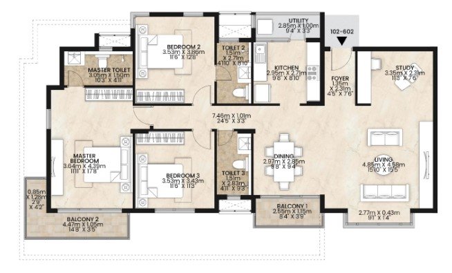 Enjoy a bright living–dining area that opens to a breezy balcony, a fully functional modular kitchen, and well-proportioned bedrooms with wardrobes. The additional study/guest room provides flexibility — ideal for a work-from-home setup or a cozy extra bedroom.