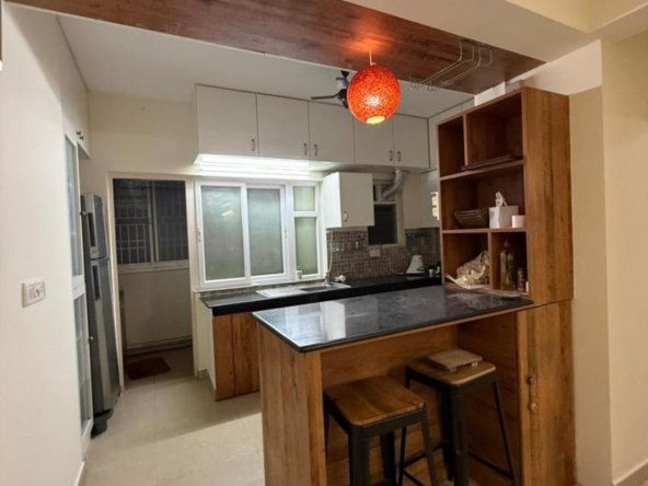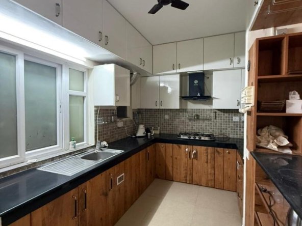 The duplex features a well-lit living room with a dedicated dining area, creating a warm and welcoming environment. The large open kitchen offers plenty of counter space and comes with a separate utility area, ensuring hassle-free daily chores.